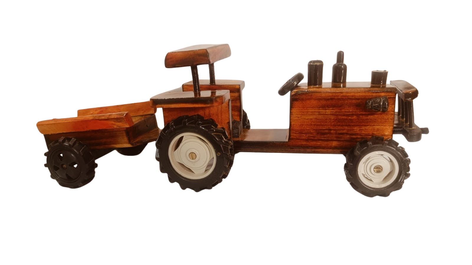 "Handcrafted wooden tractor trolley toy for kids, bringing warm village charm to modern playrooms."